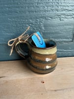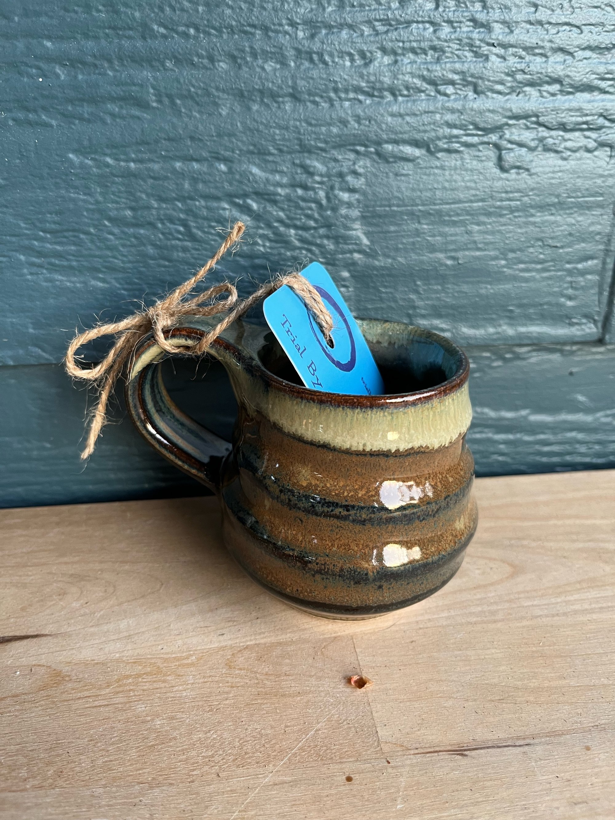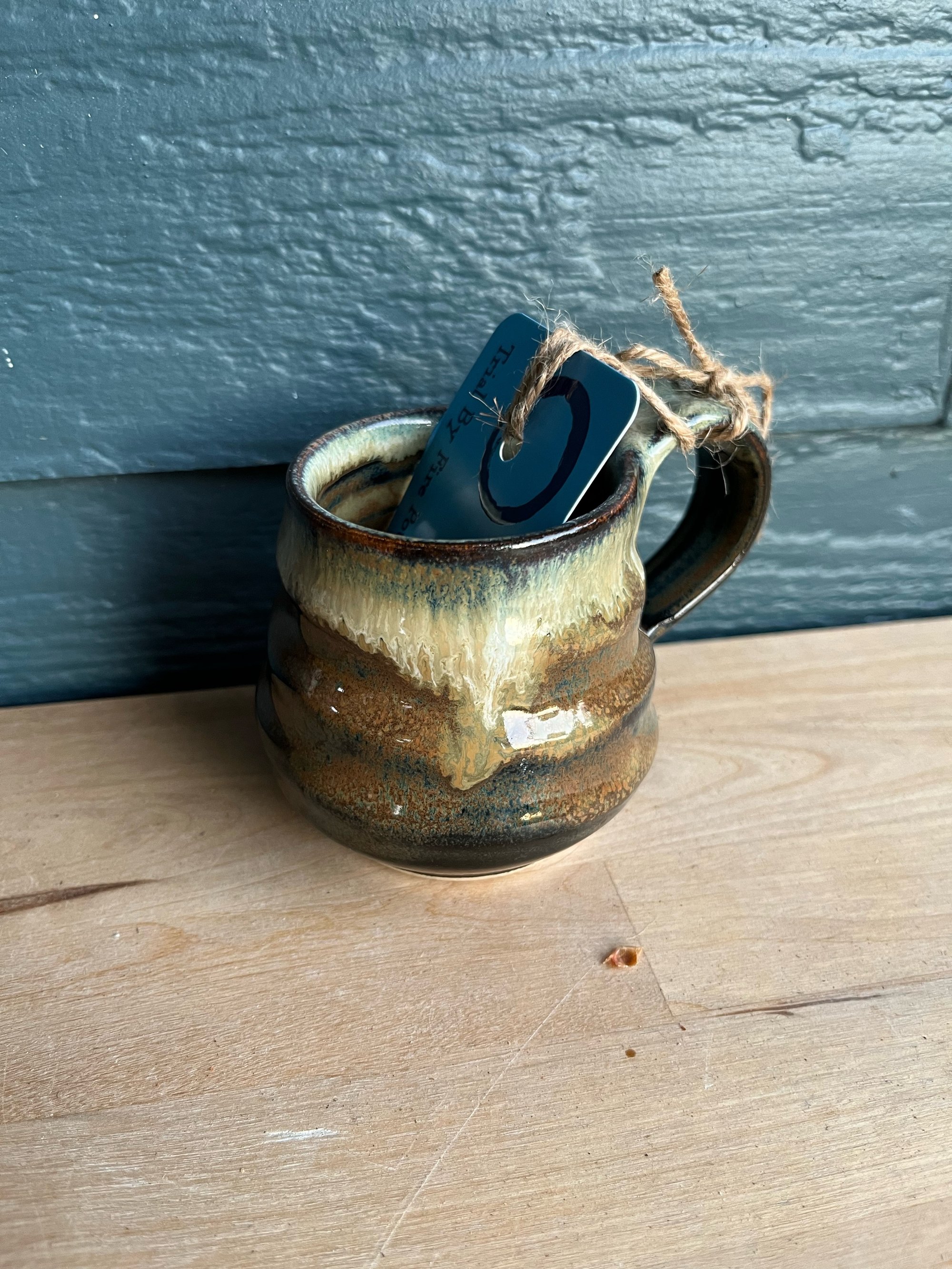 Truly TINY mug with blackish/goldish water glaze with throw rings pulled into the surface and white glaze melted into the lip.
